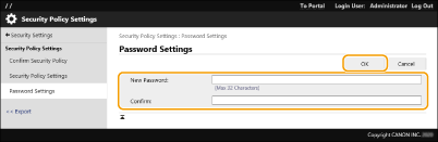 Kirjoita nykyinen salasana [Nykyinen salasana:] -kohtaan ja valitse [OK] kirjoittamatta mitään [Uusi salasana:]- tai [Vahvista:]-kohtaan (jätä ne tyhjiksi). Jos kirjoitettavien merkkien raja on määritetty kohdassa [Salasana-asetusten käytännöt], tälle asetukselle on lisättävä arvo. Peruuta raja ennen kuin poistat salasanan.