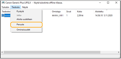 Jos et löydä peruutettavaa asiakirjaa, se on jo lähetetty laitteeseen. Tässä tapauksessa et voi peruuttaa tulostusta tietokoneesta.