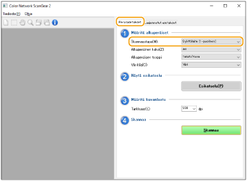 Voit määrittää skannaukseen värin, tarkkuuden ja alkuperäisen koon. Napsauttamalla [Laajennetut asetukset]-välilehteä voit määrittää tarkkoja asetuksia, kuten alkuperäisen suunnan. Lisätietoja on Color Network ScanGear 2 -ohjeessa.