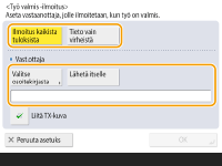 Jos haluat valita ilmoituksen vastaanottajaksi <Lähetä itselle>, sinun on tallennettava oma sähköpostiosoitteesi käyttäjätietoihin etukäteen ja kirjauduttava sisään käyttäen henkilökohtaista todentamisen hallintaa. Käyttäjätietojen tallentaminen paikalliseen laitteeseen