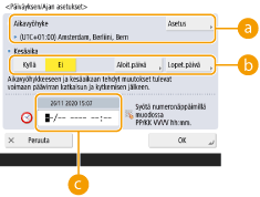 Säädä laitteen päiväystä/aikaa. Nämä asetukset on tehtävä oikein, sillä päiväystä/aikaa käytetään esimerkiksi sähköpostin automaattiseen lähettämiseen määritettynä aikana.