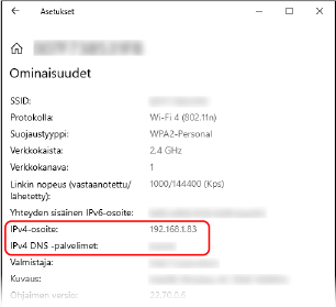 Tarkastele IP-osoitetta ja DNS-palvelinta kohdassa [Ominaisuudet].