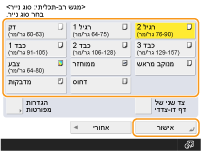 על הכפתור שאליו נרשם סוג נייר המעטפה <אישור>. רישום גודל וסוג נייר נפוצים עבור המגש הרב-תכליתי |