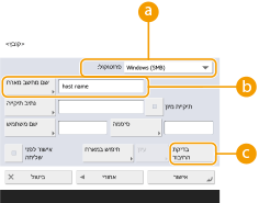 אם תבחר <Windows (SMB)>, יוצגו הלחצנים <חיפוש במארח> ו-<עיון>. ניתן לציין בקלות שרת קבצים/סביבה מתקדמת באמצעות חיפוש או הצגת הרשת.