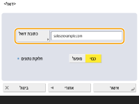 ציין אם לשלוח מסמכי I-fax דרך שרת הדוא"ל, או לא. בחר <מופעל> אם ברצונך לשלוח מסמכי I-fax דרך שרת הדוא"ל. בחר <כבוי> אם ברצונך לשלוח נתונים ישירות לנמען באותה רשת תקשורת מקומית (LAN). באמצעות שליחה ישירה לנמען, ניתן לשלוח כמויות גדולות של נתונים מבלי ליצור עומס על שרת הדוא"ל.