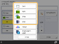 בחר <פקס>,‏ <דואל>,‏ <I-Fax>, או <קובץ> כסוג היעד לרישום. רישום יעדים בפנקס הכתובות