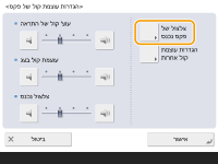כוונן את עוצמת הקול של הצליל המופק בסיום שליחה או קבלה של פקסים (למעט בעת הדפסת פקסים שהתקבלו) ואת עוצמת הקול של הצליל המופק בעת ביטול פקס או סיום הפעולה עקב שגיאה. כדי להשתיק את הצליל, לחץ על  מספר פעמים כדי להגדיר את עוצמת הקול לצד השמאלי הקיצוני.