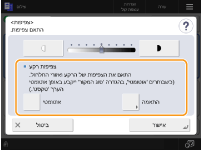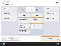 אם תגדיר <אוטו'>, יהיה עליך להגדיר את גודל הנייר באופן ידני. אם לא תבחר גודל נייר, יחס הצילום יוגדר אוטומטית כדי להתאים לגודל הנייר הטעון במגירה מספר 1.