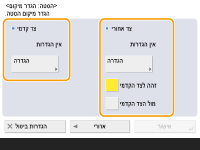 אם ברצונך להזיז את התמונה בצד האחורי בעת צילום שני הצדדים, יש צורך בהגדרה <צד אחורי>. כדי להזיז את התמונה לאותו מיקום כמו בצד הקדמי, לחץ על <זהה לצד הקדמי>. כדי להזיז באופן סימטרי, לחץ על <מול הצד הקדמי>. כדי להזיז את התמונה למיקום שונה מהמיקום בצד הקדמי, לחץ על <הגדרה> והזן את מרחק ההזזה.