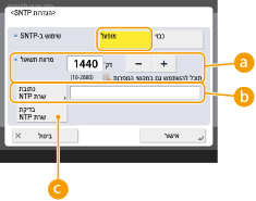 לחץ על <מופעל> באפשרות <שימוש ב-SNTP> ובצע את ההגדרות הדרושות.
