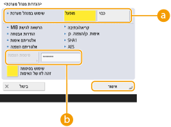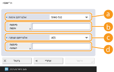 הגדרת צירוף של אימות וקידוד. בחר <אימות. כן/הצפנה. כן>, <אימות. כן/הצפנה. לא> או <מס' אימות/מס' הצפנה>.
