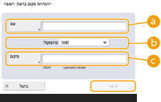 האפשרות <מיקום> מוצגת כאשר אתה בוחר <SMB>, והאפשרות <שם מחשב מארח> מוצגת כאשר אתה בוחר <WebDAV> בהגדרת הפרוטוקול.