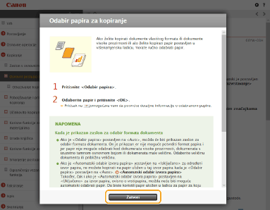 Kada kliknete ikonu, trenutna će se stranica može zatamniti i prikazat će se skočni prozor. Da biste se vratili na stranicu, kliknite [Zatvori] u skočnom prozoru.