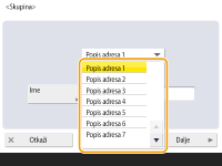 Možete izraditi grupu iz odredišta registriranih u odabranom popisu adresa. Na primjer, ako odaberete popis <Popis adresa 2>, grupi ne možete dodati odredište registrirano u popisu <Popis adresa 1>. Izrađena grupa bit će registrirana u popisu adresa koji odaberete u ovom koraku.