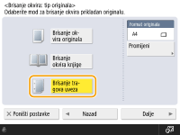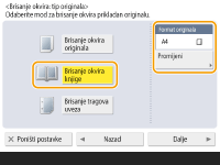 Prilikom kopiranja izvornika koji su manji od izlaznog formata papira, na kopiranoj slici mogu se pojaviti crte okvira izvornika. Prilikom kopiranja debele knjige mogu se pojaviti tamni obrubi. <Brisanje okvira> omogućuje brisanje tih crta okvira i tamnih obruba. Uređaj možete podesiti da ne kopira rupe od bušilice za papir na izvornicima.