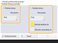 Ako želite pomaknuti sliku sa stražnje strane kad kopirate obje strane, potrebna je postavka <Stražnja strana>. Za pomicanje u isti položaj kao i prednja strana pritisnite <Isto kao prednja strana>. Za simetrično pomicanje pritisnite <Obrnuto od prednje strane>. Za pomicanje u drugi položaj s prednje strane pritisnite <Podesi> i unesite pomak.