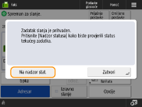 Kad je <Prikaži obavijest kad je zadatak prihvaćen> postavljeno na <Da>, zaslon <Nadzor statusa> može se prikazati sa sljedećeg zaslona koji se prikazuje nakon primanja zadatka slanja. <Prikaži obavijest kad je zadatak prihvaćen>