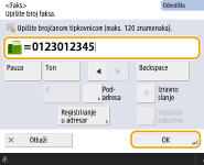 Za međunarodno slanje faksovaUnesite međunarodni pristupni broj, pozivni broj države i broj faksa. Ako se možete uspješno povezati s odredištima u inozemstvu, pritisnite <Pauza> da biste umetnuli pauzu između broja i sljedećeg broja.