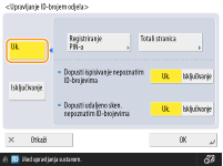 Prijava korištenjem ID-ja odjela i PIN-aAko registrirate korisnika s istim imenom kao što je ID odjela, radnje prijave moguće je obaviti koristeći registrirani ID odjela i PIN. Registriranje podataka uređaja na lokalnom uređaju