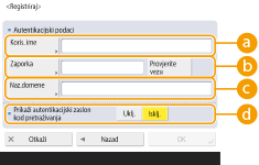 Prilikom unosa IP adrese provjerite podržava li upotrebljivi DNS poslužitelj samo pretraživanje unaprijed. Kad DNS poslužitelj podržava samo pretraživanje unaprijed, pritisnite <Ne koristi> ili <Upotrijebi> u <Autentikacijski podaci> u koraku 4. Ako odaberete mogućnost <Koristi (sigurn. autoriz.)>, provjerite podržava li DNS poslužitelj pretraživanje prema natrag.