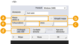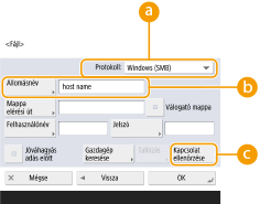 Ha a <Windows (SMB)> lehetőséget választja, megjelennek a <Gazdagép keresése> és a <Tallózás> gombok. A hálózat keresésével vagy megtekintésével könnyen megadhatja a fájl/Tárhely értéket.