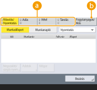 (Állapotfigyelő) gomb megnyomásakor megjelenik az <Állapotfigyelő> képernyő. Ezen a képernyőn ellenőrizheti a nyomtatás állapotát és az átviteli állapotot, valamint a fennmaradó festékmennyiséget és a memóriaszintet.