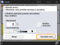 Nyomja meg a <Nyomtatás indul> gombot a megadott példányszám kinyomtatásához. Ha az 5. lépésben a <Minden oldal> lehetőséget választotta, akkor a készülék a másolatok számánál eggyel kevesebbet nyomtat. Ha az 5. lépésben a <Megadott oldalak> lehetőséget választotta, akkor a készülék a megadott számú másolatot nyomtatja.