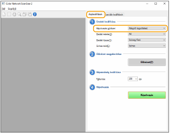 Megadhatja a színt, felbontást és az eredeti méretét a beolvasáshoz. Az [Speciális beállítások] lapra kattintva részletes beállításokat is végezhet, amilyen például az eredeti tájolása. További információkat a Color Network ScanGear 2 súgójában talál.