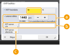 Nyomja meg a <Be> gombot az <SNTP használata> lehetőségnél, és végezze el a szükséges beállításokat.