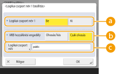 A dedikált logikai csoport a Canon eszközfelügyeleti szoftverhez előre beállított logikai csoport. A dedikált logikai csoport használatához nyomja meg a <Kijelölt logikai csoport beállítás> gombot. Az általános logikai csoport megadásához nyomja meg a <Logikai csoport név 1 beállítás> vagy a <Logikai csoport név 2 beállítás> lehetőséget.