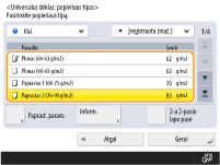 Informacijos ekrane <Popieriaus tipas> negalima pasirinkti voko popieriaus tipo. Norėdami pasirinkti voko popieriaus tipą, užregistruokite popieriaus tipą <Parank. pop. registravimas (universalus dėklas)>, tada paspauskite <Parankinis popierius> (atlikdami 2 veiksmą)