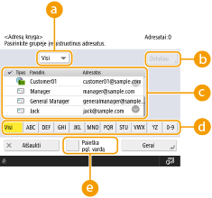 Pasirinkite raidinį ir skaitinį mygtuką pirmai adresato vardo ar pavadinimo raidei. Paspauskite <Visi>, jei norite rodyti visus užregistruotus adresatus.