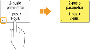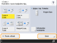 Rodoma nustatymo būsena, pvz., kopijavimo mastelis, kopijavimo popierius ir kopijų skaičius. Jei norite pakeisti parametrą, pasirinkite reikiamą parametro elementą.