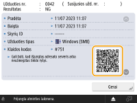 Kai klaidų žurnalo išsamios informacijos lange rodomas QR kodas, nuskaitę QR kodą mobiliuoju įrenginiu, pvz., išmaniuoju telefonu ar planšetiniu kompiuteriu, galite pasiekti šio aparato Vartotojo instrukcija puslapį, kuriame nurodoma, kaip valdyti klaidą.