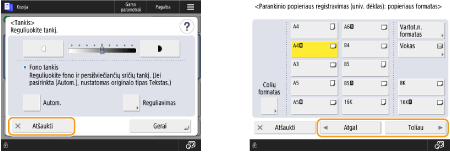 Taip pat rodomi tokie mygtukai, kaip <Atšaukti>, skirtas atšaukti parametrą ir grįžti į ankstesnį ekraną, <Toliau>, skirtas pritaikyti parametrą ir pereiti į kitą ekraną, <Atgal>, skirtas grįžti į ankstesnį parametro ekraną, ir <Uždaryti>, skirtas uždaryti tuo metu atidarytą ekraną.