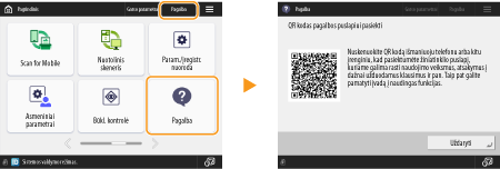 Paspaudus <Pagalba>, rodomas QR kodas. Nuskaitydami šį QR kodą mobiliuoju įrenginiu, pvz., išmaniuoju telefonu ar planšetiniu kompiuteriu, galite pasiekti šio aparato Vartotojo instrukcija puslapį.