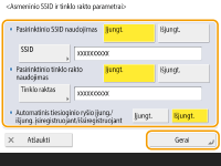 Paspausite <Asmeninio SSID ir tinklo rakto parametrai>, nurodykite asmeninį SSID ir tinko raktą ir paspauskite <Gerai>.