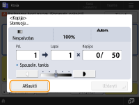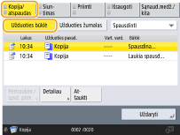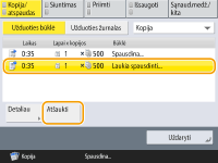 Paspaudus  (Stabdyti) valdymo skydelyje, kol laukia kopijavimo užduotys, visos kopijavimo užduotis pristabdomos ir rodomas pranešimas <STOPPasirinkite kopijavimo užduotį, kurią norite atšaukti.> ir kopijavimo užduočių sąrašas. Iš sąrašo galite pasirinkti kopijavimo užduotį ir atšaukti užduotį paspausdami <Atšaukti>. Jei norite atnaujinti kopijavimą, paspauskite <Tęsti kopijavimą>.