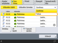 Paspauskite (Stabdyti) esant kelioms siuntimo užduotims, kad būtų rodomas atšaukiamos siuntimo užduoties pasirinkimo ekranas. Jei siuntimo užduotis, kurią norite atšaukti, nerodoma, paspauskite <Patikrinti kitas užduot.>, kad būtų rodoma <Siuntimo užduotys>. Pasirinkite užduotį, kurią norite atšaukti, ir paspauskite <Atšaukti>.
