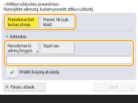 Norėdami pasirinkti adresatą, kuriam bus pranešta, iš <Adresų knyga>, būtina adresatą iš anksto užregistruoti. Adresatų registravimas adresų knygelėje