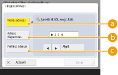 Nurodykite IP adresų diapazoną naudodami prefiksą (tinklo adresai.) <Adresas> įveskite tinklo adresą, o tinklo adreso ilgį nurodykite <Prefikso ilgis>.