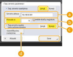 Nustatykite <Tarp. serverio naudojimas> į <Įjungt.>, sukonfigūruokite reikiamus parametrus ir spustelėkite <Gerai>.