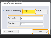 Norėdami naudoti serverio autentifikavimo funkciją, spustelėkite čia ir sukonfigūruokite tapatybės patvirtinimo informaciją. Rodomame ekrane spustelėkite <Įjungt.>, įveskite vartotojo vardą ir slaptažodį, kurie bus naudojami tarpinio serverio autentifikavimui, tada spustelėkite <Gerai>.