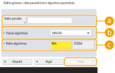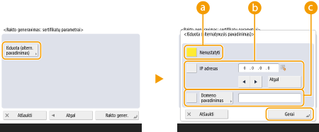 (Nust./Įreg.) <Valdymo parametrai> <Aparato valdymas> <Sertifikatų parametrai> <Raktų ir sertifikatų sąrašas>. Jei raktų ir sertifikatų sąrašas nerodomas, pamatysite jį spustelėje <Šio aparato raktų ir sertifikatų sąrašas>.Jei rodoma