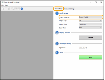 Dalyje [Scanning Method], skirtuke [Basic Settings] pasirinkite vietą, kur padėtas originalas.