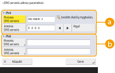 Paspauskite <Pirminis DNS serveris> ir įveskite DNS serverio IPv6 adresą. Negalite įvesti adresų, prasidedančių „ff“ (sudėtiniai adresai), adresų, kuriuos sudaro tik „0“, arba vietinių nuorodų adresų.
