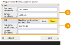 Norėdami nustatyti tokį pat kaip IPv4 pagrindinio kompiuterio pavadinimą ir domeno vardą, paspauskite <Įjungt.> dalyje <Naud. tą p. pgr. kmp./dom. pav. kaip ir IPv4>. Norėdami nustatyti kitaip nei IPv4 paspauskite <Išjungt.>.