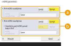 Norėdami nustatyti tuos pačius mDNS vardo kaip IPv4 parametrus, paspauskite <Įjungt.> parinktį <Naudoti tą patį mDNS pavad. kaip ir IPv4>. Norėdami naudoti skirtingus parametrus, paspauskite <mDNS pavadinimas> ir įveskite pasirinktą mDNS vardą raidėmis ir skaičiais.