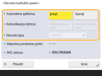 Įprastai paspauskite <Įjungt.> dalyje <Automatinis aptikimas>. Ryšio sistema ir Etherneto tipas aptinkami ir automatiškai konfigūruojami.