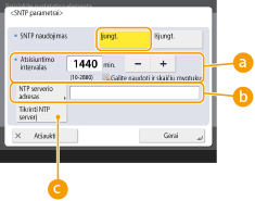 Paspauskite <Įjungt.> dalyje <SNTP naudojimas> ir nustatykite būtinus parametrus.